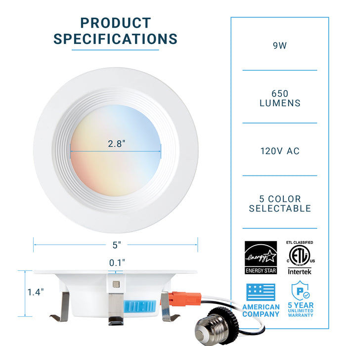 The Parmida LED Technologies™ 5/6 Inch Baffle Trim 5CCT Downlight is an enhanced and modernized retrofit light. Manufactured with innovative Easy Multi Installation technology to provide a much simpler and more secure installation process that is compatible with any 5" or 6" housing, modern or traditional. E26 Adapter and Title 24 connector included. Set the color temperature of your lights to the desired level with a simple flip of a switch. Choose between Warm White (2700K), Soft White (3000K), Cool White (4000K), Day Light (5000K), and Bright White (6000K). This product is built with Steady-Dim technology and is compatible with most LED dimmers. With 100-10% dimming capability, you can set the mood and ensure the perfect level of light in your space.