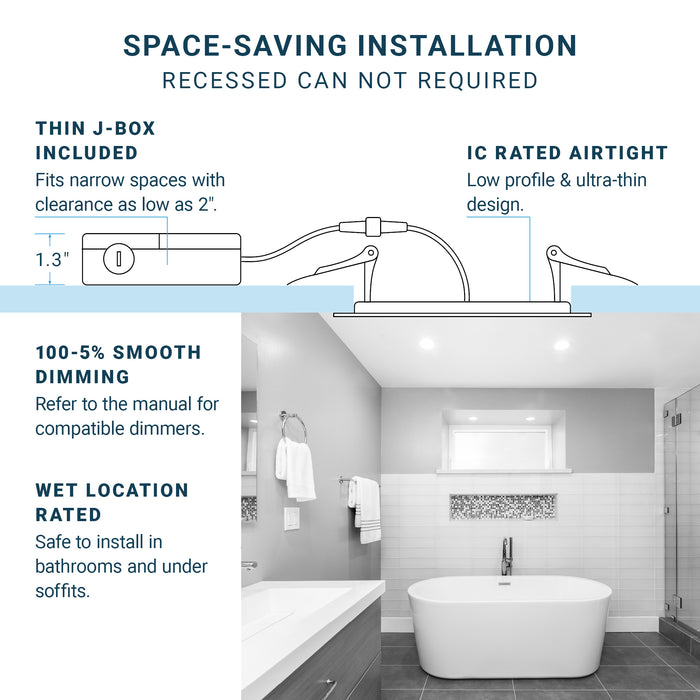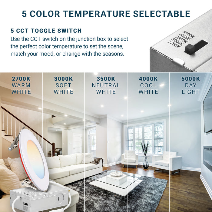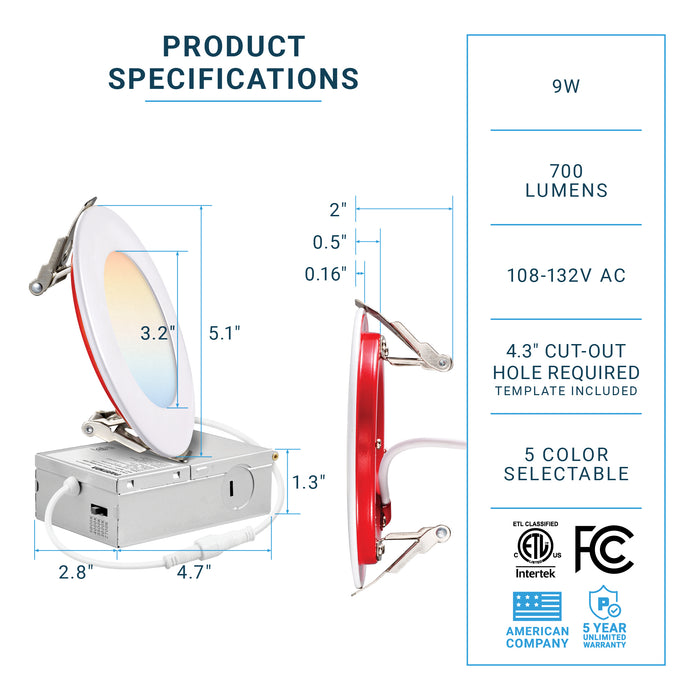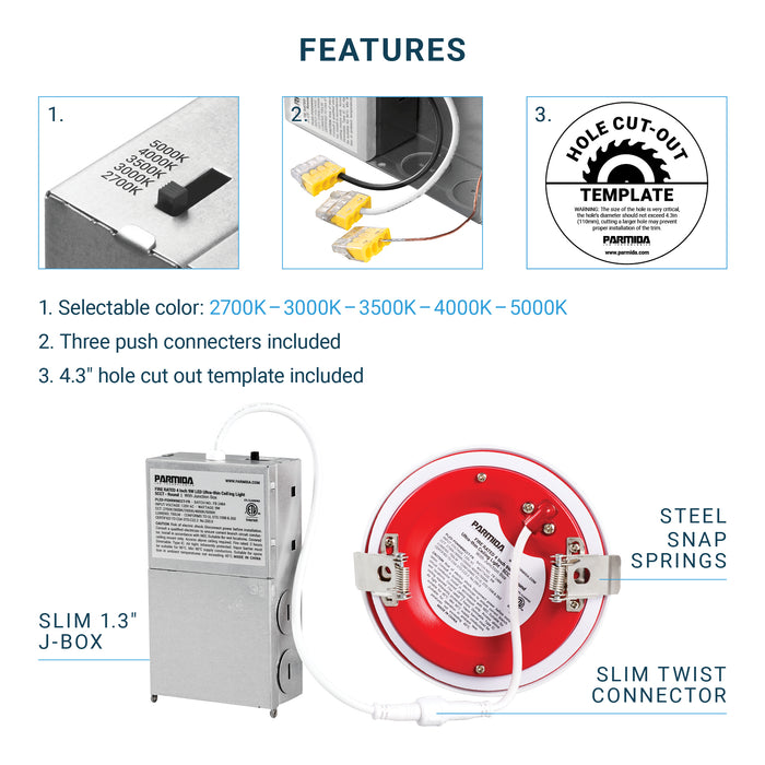 This Parmida LED 4” 9W Slim Panel Canless Wafer Recessed Downlight comes with a 2-Hour Fire Rating, and a 5 Color Temperature Selectable switch. Made of heat-resistant aluminum, this light can be installed without additional precautions such as fire-rated housing. This 2 hour fire rated light is guaranteed by UL 263, ASTM E119, UL 1598, and CAN ULC S101 certifications. This light has a 5CCT switch, eliminating the need to purchase multiple color temperatures. Simply install and choose your preferred color temperature - 2700K, 3000K, 3500K, 4000K, and 5000K - and enjoy strong, powerful light in a slim, attractive design suitable for any room. Dimmable, wet-location rated, ETL & FCC certified.