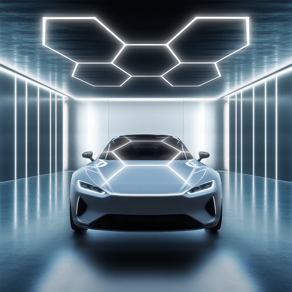 • SLEEK & UNIQUE DESIGN: This hexagon LED garage system features a distinctive arrangement of 5 interconnected hexagons, ensuring your entire space is evenly and fully illuminated. The honeycomb effect not only provides uniform, shadow-free lighting but also adds a stylish, modern touch to any environment. Perfect for enhancing garages, workshops, and more, this design creates a professional yet contemporary atmosphere that stands out.