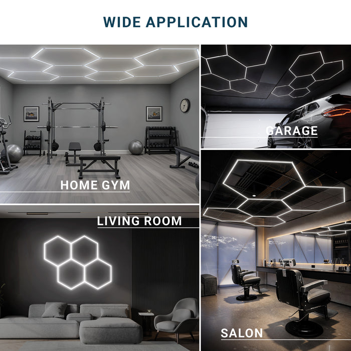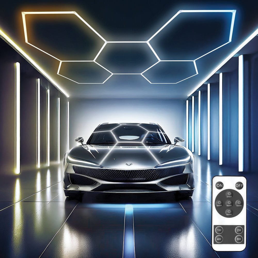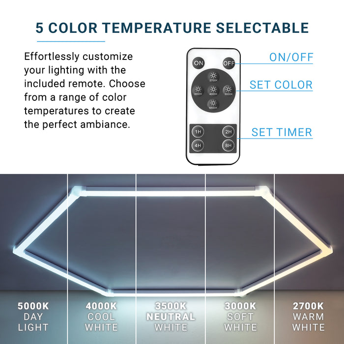- 5 COLOR CHANGING OPTIONS – Easily switch between 5 white color temperatures with the included remote control. Choose from Warm White (2700K), Soft White (3000K), Cool White (4000K), Day Light (5000K), and Cool White (6000K). The hexagon LED light features 5 interconnected hexagons, ensuring even illumination with a honeycomb effect that provides uniform, shadow-free lighting. Perfect for garages, workshops, and more, adding a stylish, modern touch to any space.