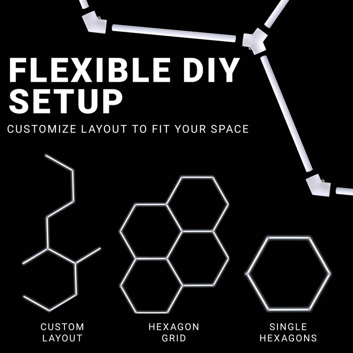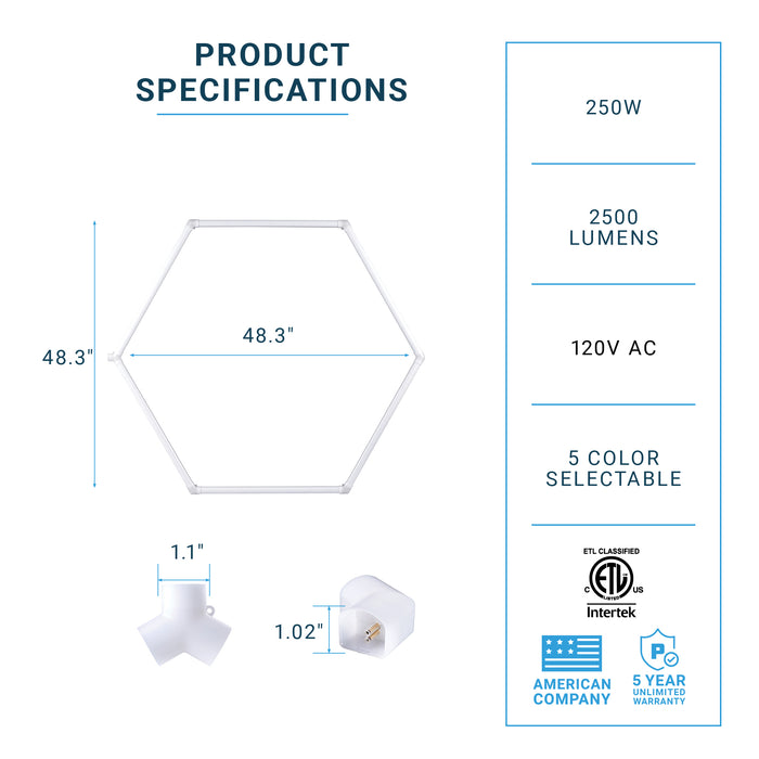 Transform your space with our 250W Hexagon Garage Light, a cutting-edge hexagonal lighting system designed to deliver an impressive 25,000 lumens of brightness. Featuring 5 color-changing options, easily switch between Warm White (2700K), Soft White (3000K), Cool White (4000K), Day Light (5000K), and Cool White (6000K) using the included remote control. Ideal for garages, workshops, auto shops, and more, this light ensures exceptional visibility and uniform lighting, enhancing productivity. The light is crafted from high-quality PC materials, offering impact, corrosion, and heat resistance to withstand demanding environments. With a unique design of 5 interconnected 2FT hexagon light bars, it creates a stylish honeycomb light effect for a modern, professional look. This versatile hexagon garage light is ideal for DIY enthusiasts, offering simple do-it-yourself installation with either plug-in or hardwired options. All necessary accessories—including power cords, connectors, and mounting hardware—are included to make the process hassle-free. Rated for damp locations, this energy-efficient light is built to last, providing long-lasting, reliable performance for any workspace. ETL Listed and FCC Certified for your peace of mind.