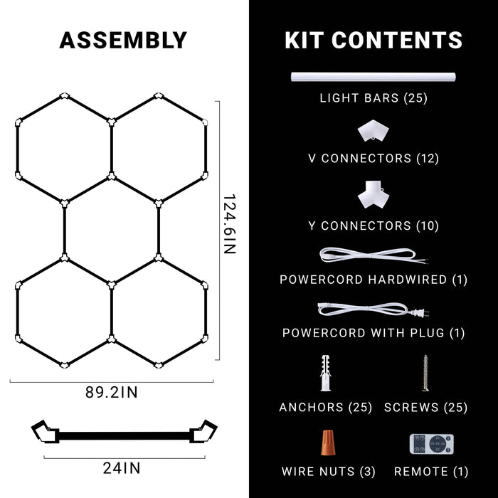 - DIY & VERSATILE INSTALLATION – Designed with convenience in mind, our hexagonal LED lights is perfect for do it yourself enthusiasts. Whether you prefer plug-in or hardwired installation, all necessary accessories are included for a seamless setup. The kit features a 5FT power cord with a plug, a 5FT hardwire power cord, 12 V Connectors, 10 Y Connectors, nylon cables, and mounting hardware. Plus, with the included remote control, you can adjust the lighting with ease for ultimate flexibility.